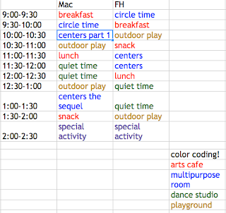 Each group has one half-hour block for each meal, one for circle time, and two each for centers and outdoor play. We'll do our special afternoon activities as one large group in the arts cafe.
